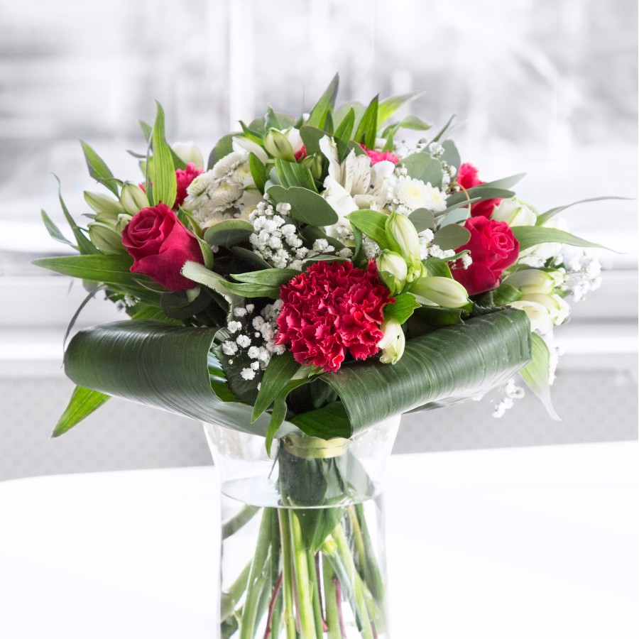 Embrace the beauty of our exquisite bouquet, featuring vibrant red roses paired with elegant white chrysanthemums. Enhanced by gypsophila and aspidistra leaves, this arrangement is a perfect blend of color and sophistication.