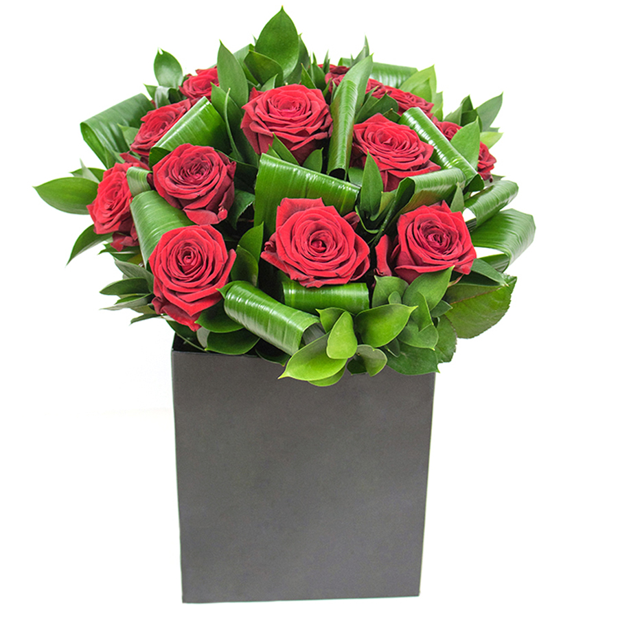 Our Charming Red Rose & Green Bouquet combines the classic beauty of red roses with the rich textures of aspidistra and ruscus, resulting in a unique and elegant floral arrangement that brightens any room.